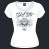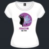 Tee-shirt en coton 190g/m2 blanc avec motif casque en impression sérigraphique couleurs et pailletée.